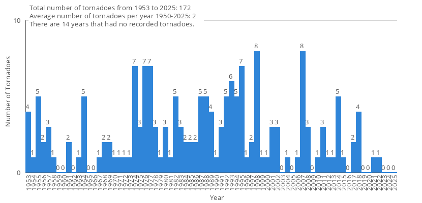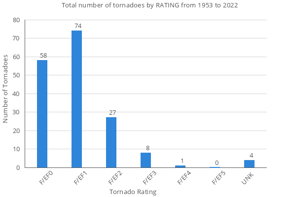The paths on the map above represent the tornado tracks of all the tornadoes listed in the table below. You may need to zoom in one or more times to view the shorter tracks.